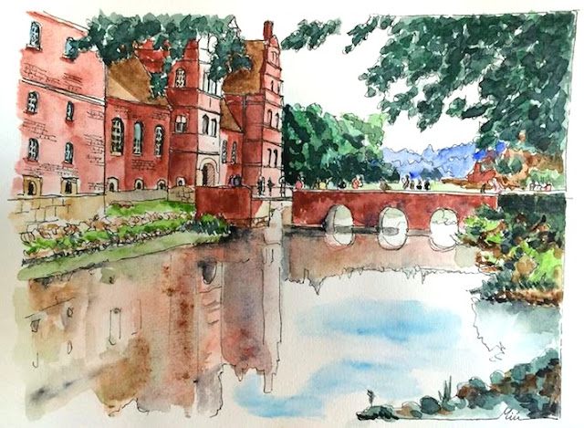 O cavaleiro não o vi, mas o castelo dele – ou que poderia ser dele, a Sophia que confirme – sim. Foi em 2008, nas imediações de Aarhus (mais concretamente em Auning, uns quilómetros a nordeste), que visitei este castelo encantador: Gammel Estrup. A construção mais antiga é do séc. XIV, mas li que foi com as sucessivas gerações da família Skeel, uma das mais importantes da aristocracia dinamarquesa, que ao longo dos séculos seguintes o castelo conheceu o apogeu. Em 1930 foi transformado num museu. Visitei-o com os colegas de uma conferência internacional, numa excursão de uma tarde de Agosto. Aqui está a minha versão do que vi: