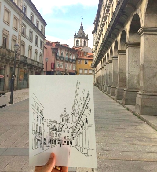 De volta ao desenho in situ, aqui na urbe. Uma rua sem carros, casas coloridas, a torre de uma igreja (what else?, Braga will be Braga), as traseiras da Arcada, arcada também. 18ºC em Fevereiro! Mas o meu rabo gelado, porque sentado no degrau de pedra. E um desenho certinho, teimosamente certinho: