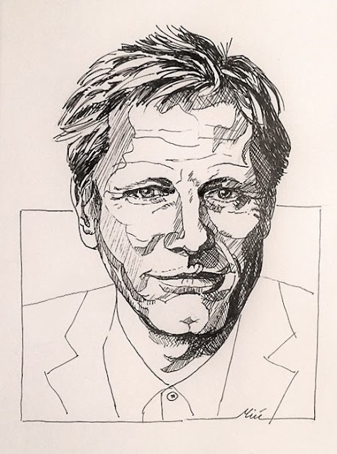 Quando nos convidam para uma festa de aniversário, nem sempre é fácil escolher um presente. No caso do Tó, em vez de livros, discos, vouchers, ou outra macaquice qualquer, resolvi fazer-lhe um retrato a preto-e-branco. Estava ciente de que o hatching (ou "hachura") lhe poderia pôr uns anos em cima, ao acentuar ângulos, vincos e rugas. Felizmente acabei por não desgostar do resultado -- e acho que ele também. Objetivo cumprido 😅!